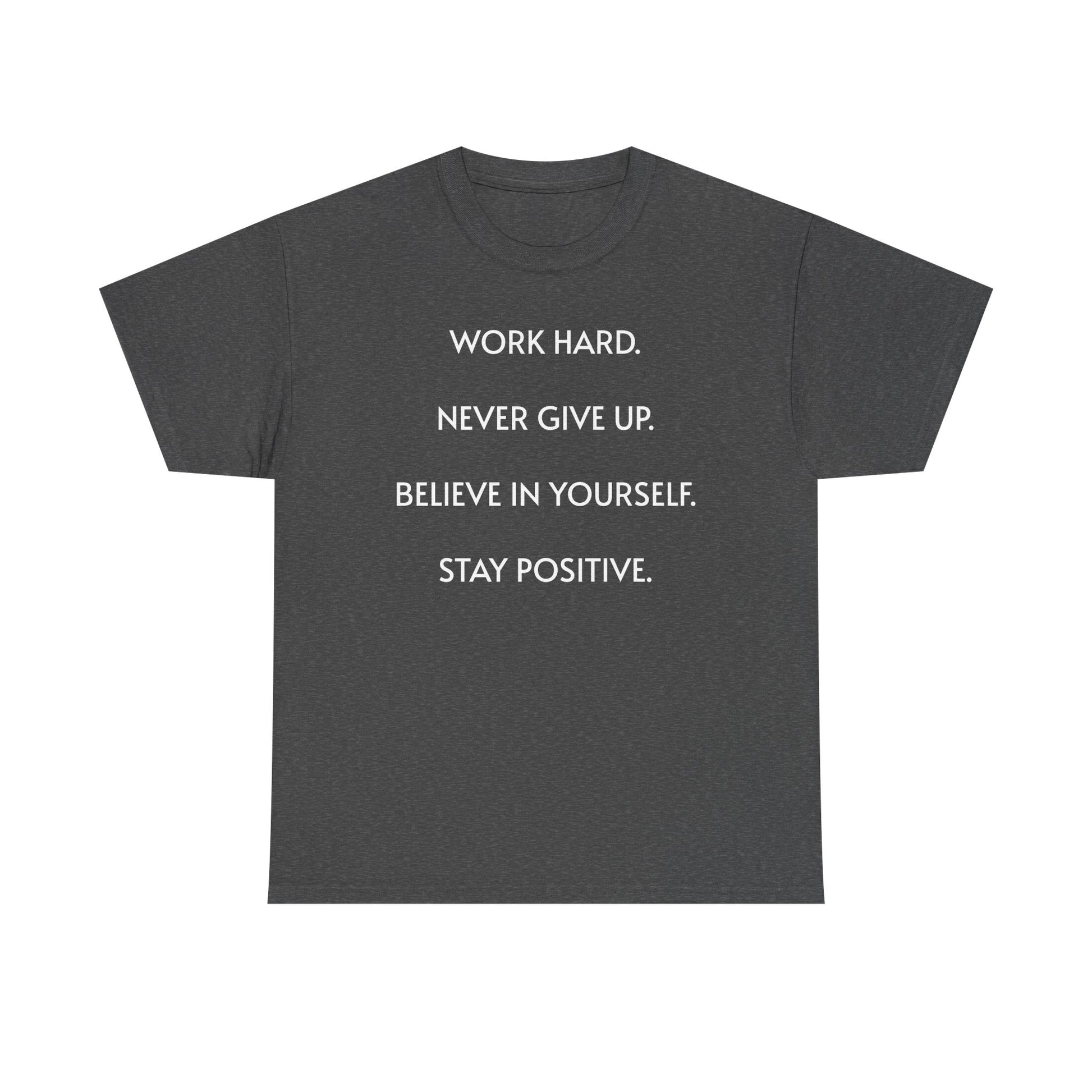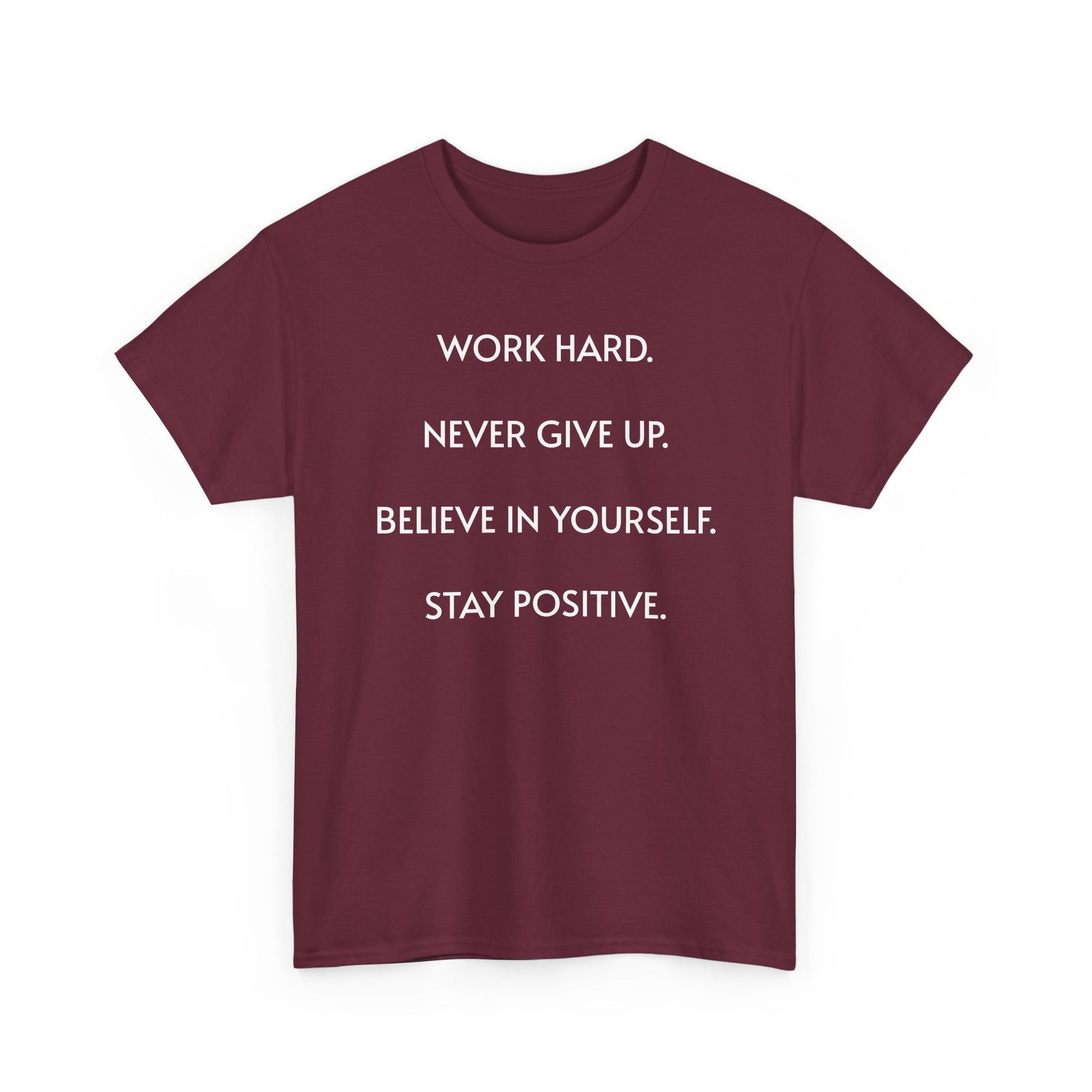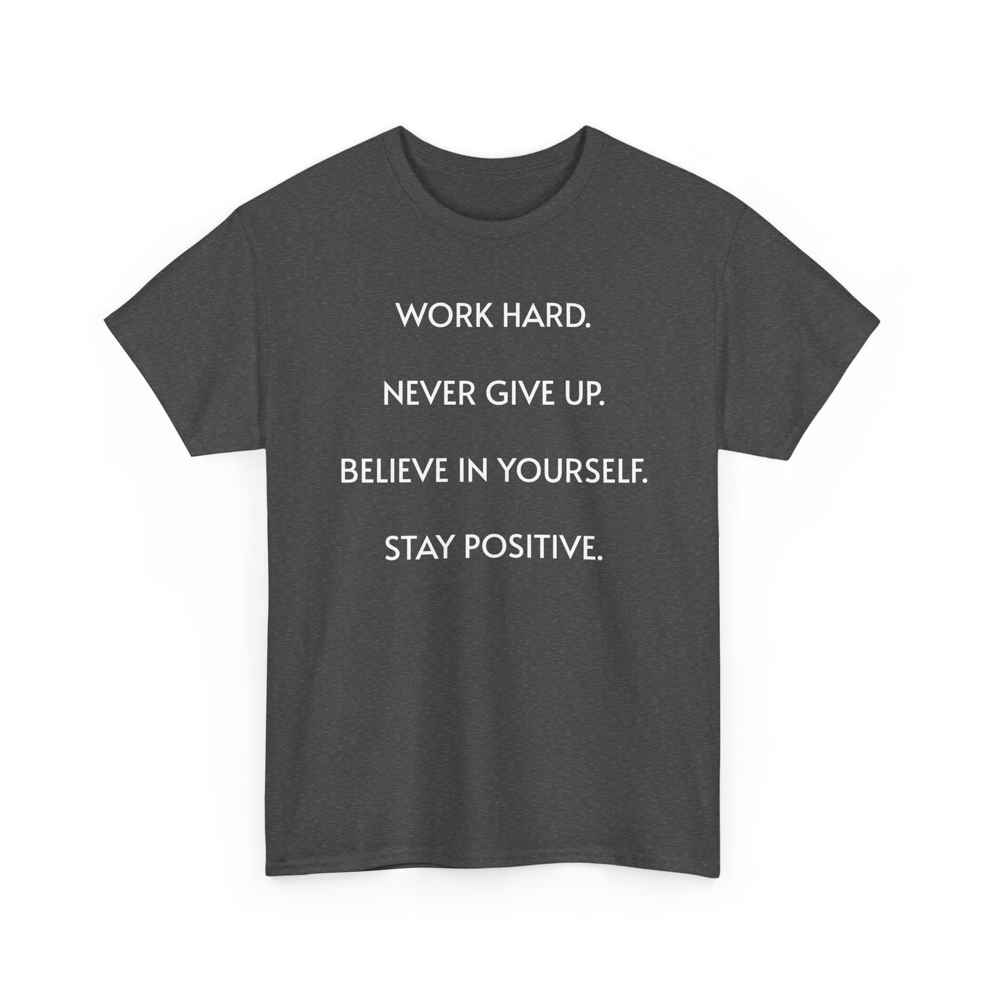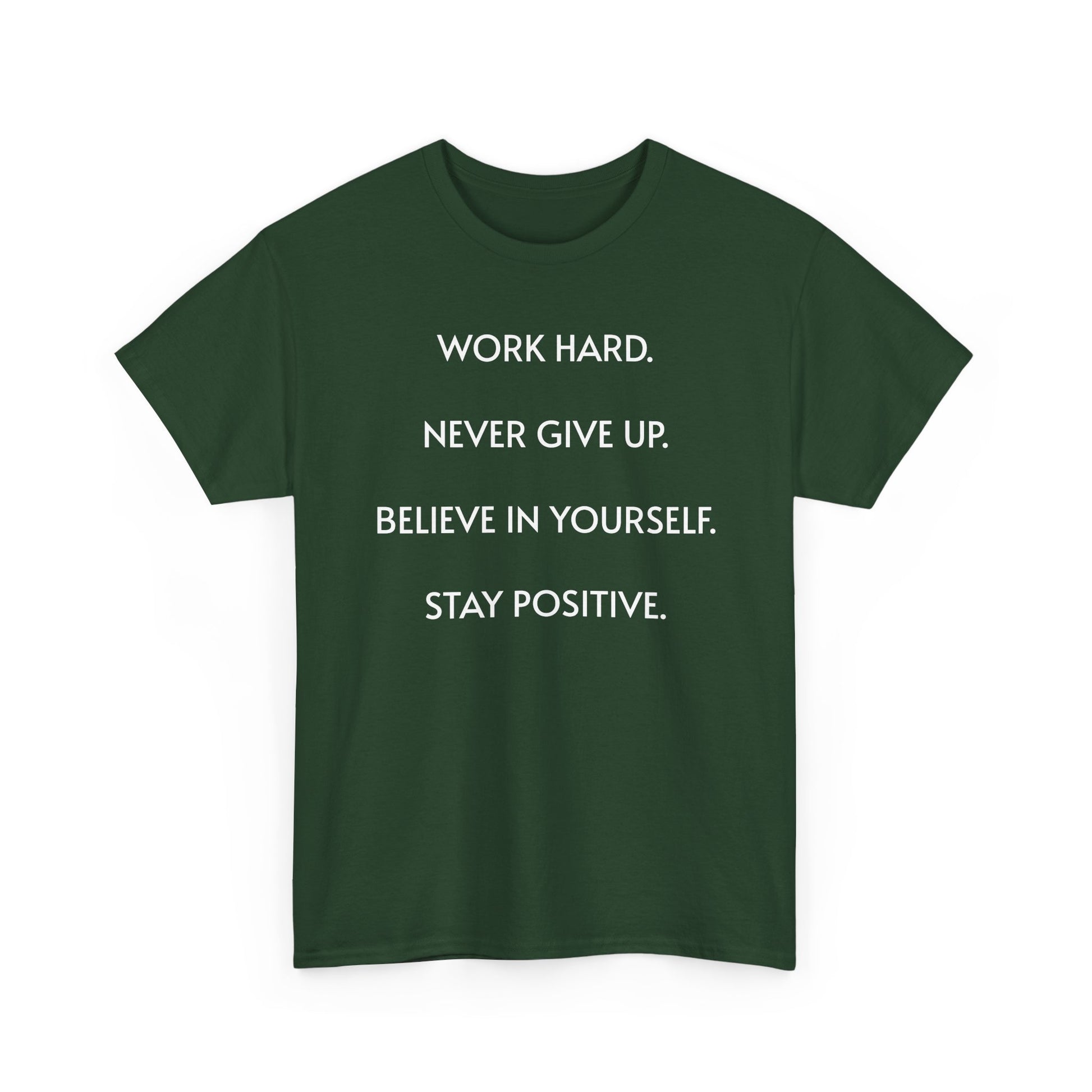 Motivational Quote Tee — "Work Hard. Never Give Up. Believe in Yourself. Stay Positive."