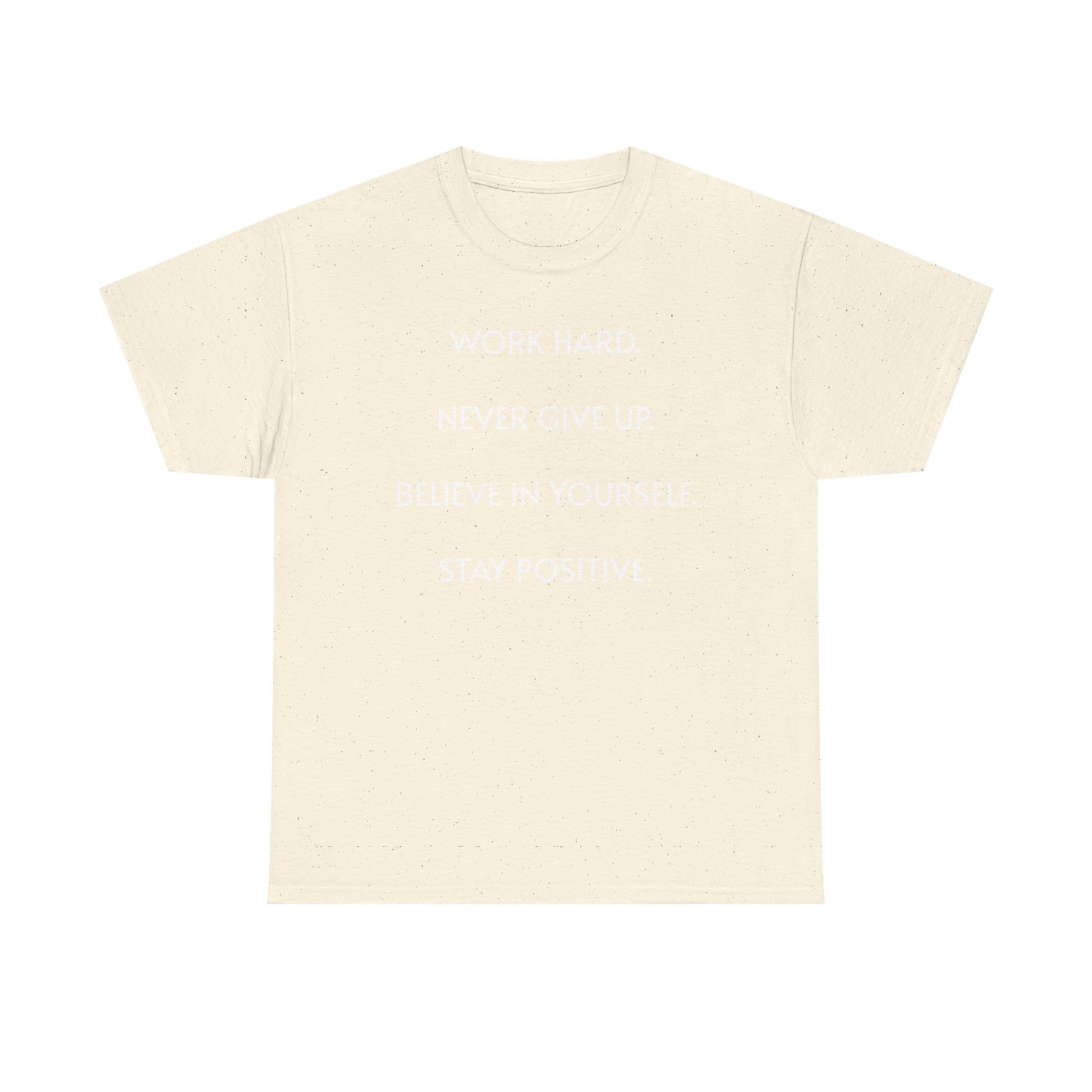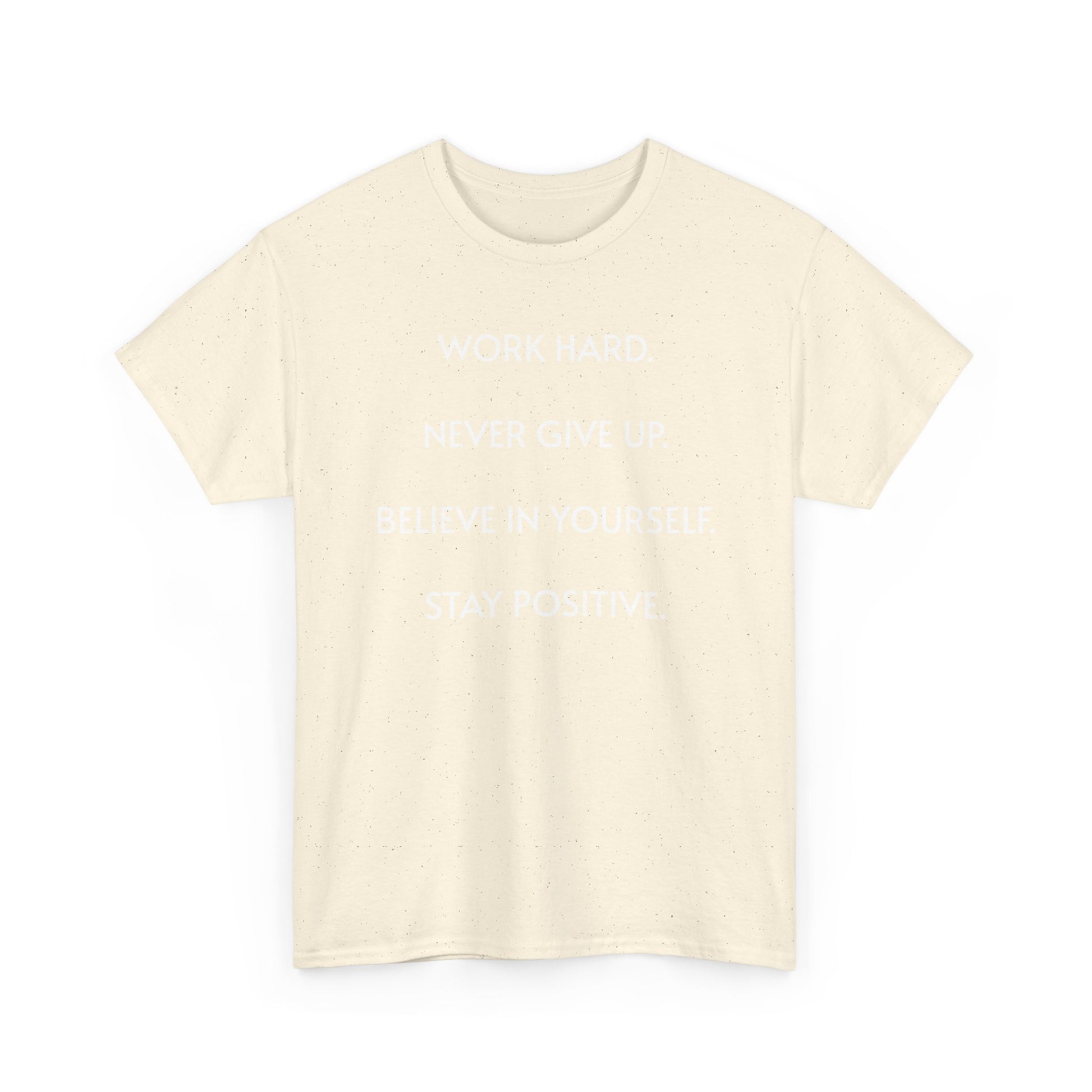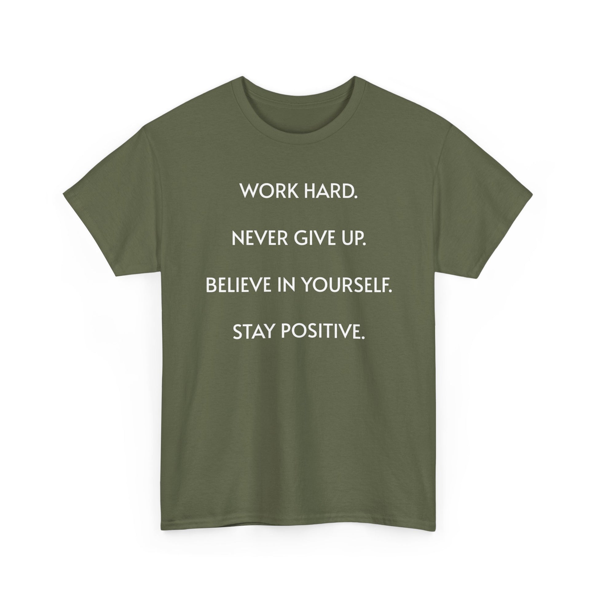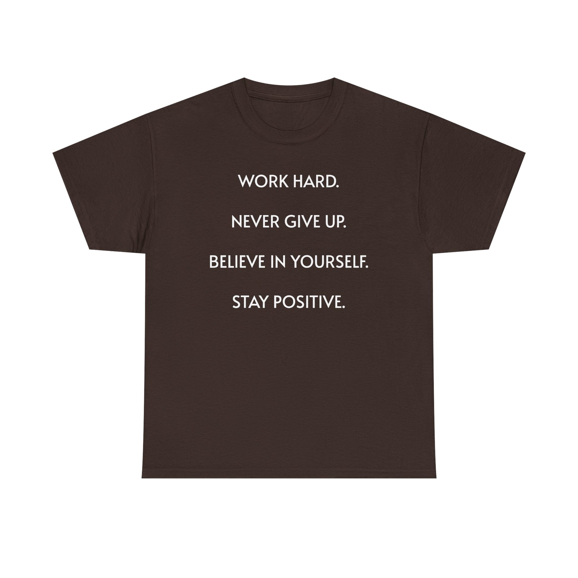 Motivational Quote Tee — "Work Hard. Never Give Up. Believe in Yourself. Stay Positive."